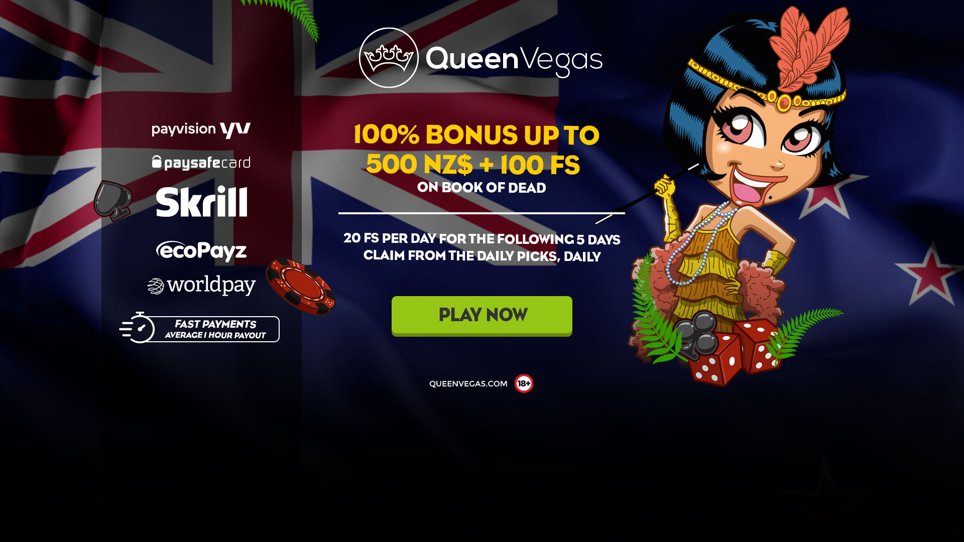 First Deposit Only. Min. deposit: $20, max. Bonus $500. Game: Book of Dead. Spin Value: $0.1. Free spins credited over 5 days only when using the '5 Days of Spins' Daily Pick. WR of 30x Deposit Plus Bonus amount (Slots count 100% and any other game 10%) within 30 days. Max bet is 10% (min $0.10) of the Bonus amount or $5 (lowest amount applies). Spins must be used and/or Bonus must be claimed before using deposited funds. Deposit/Welcome Bonus can only be claimed once every 72 hours across all Casinos. This offer is only available for specific players that have been selected by Queenvegas . If you have arrived on this page not via the designated offer via Queenvegas you will not be eligible for the offer. Bonus Policy applies.